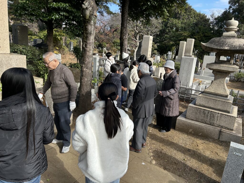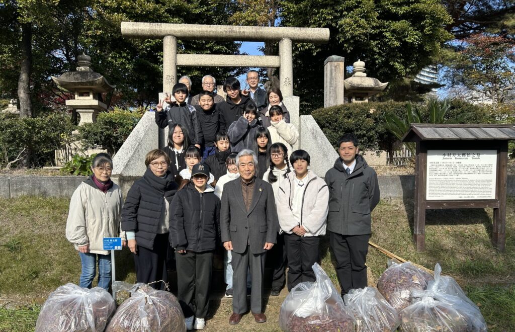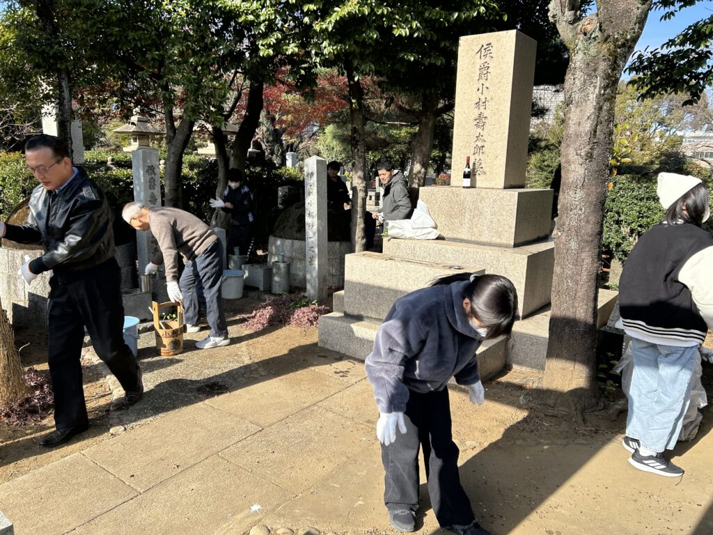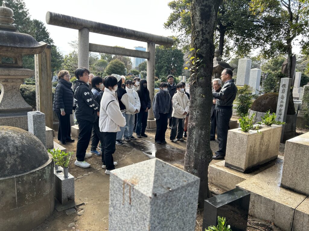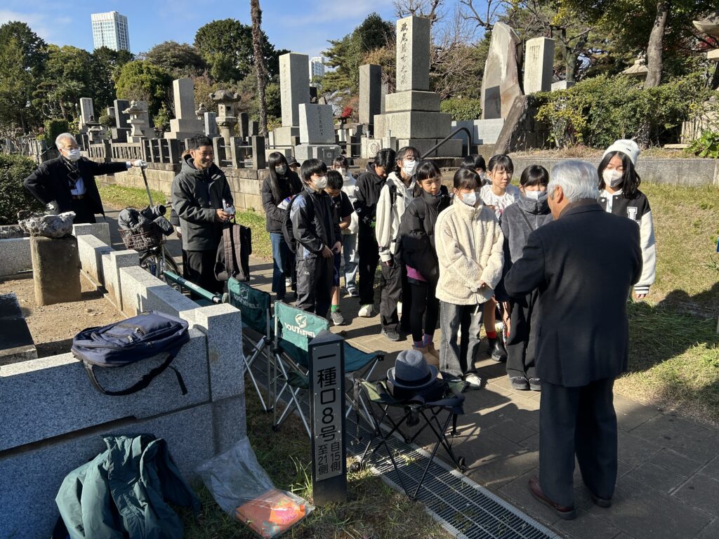 12月13日 10時「いとうや青山霊園茶屋」集合で、当会のメンバー5名にてお墓で迎え入れの準備をしながら待っていました。昨年は塾生達の到着が予定より早かったので早めの集合でしたが、今年はバスの運行路が変わり予定よりもっと早く到着。 男子3名、女子10名の六年生13名と引率者2名の合計15名の迎え入れとなりました。 晴天の少し肌寒い中、皆さんが一生懸命に清掃をしてきれいになりました。 全員でお参りした後、下苙会長の挨拶に続いて、郡司副会長より小村侯の人となりと青山墓地にどのようにお墓ができたのかの話しがあり、塾生達は真剣に聞いていました。 その後全員による集合写真撮影を行い、早朝の日南発の為、お腹も空いているだろうとおにぎりとお茶でねぎらい、最後に当会から昨年同様に塾生にシャープペンシルと替え芯をセットにしてプレゼントしました。 塾生達にとって充実した時間であっただろうと思います。